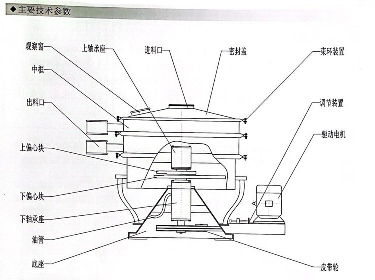 搖擺篩有進料口、上蓋、篩網(wǎng)、觀察孔、篩框、密封圈、調(diào)整塊、彈簧、出料口、底座、電機、檢查孔、皮帶輪等主要組成部分,清網(wǎng)裝置有彈跳球、轉(zhuǎn)筒刷、超聲波等。在糧食、化工、醫(yī)藥、塑料、建材、飼料、化肥等多種行業(yè)中均有使用。